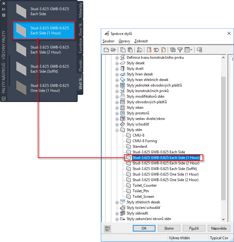 . Pokud chcete například vytvořit nástroj stěny se stylem Hrázděná-3,625 sádrokartón-0,625 každá strana (1 hodina), rozbalte položku Styly stěn a vyberte styl Hrázděná-3,625 sádrokartón-0,625 každá strana (1 hodina).