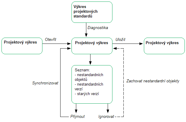 Když je projekt nebo projektový výkres synchronizován s jeho normami, jeho styly a nastavení zobrazení jsou porovnány s projektovými normami, aby byly nalezeny nesrovnalosti verzí mezi nimi a jejich následnou opravu.