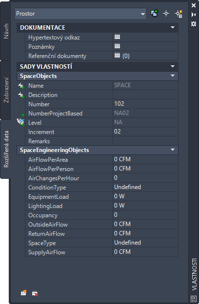 Sada vlastností je přidána k vybraným prostorům a lze ji zobrazit na kartě Rozšířená data.