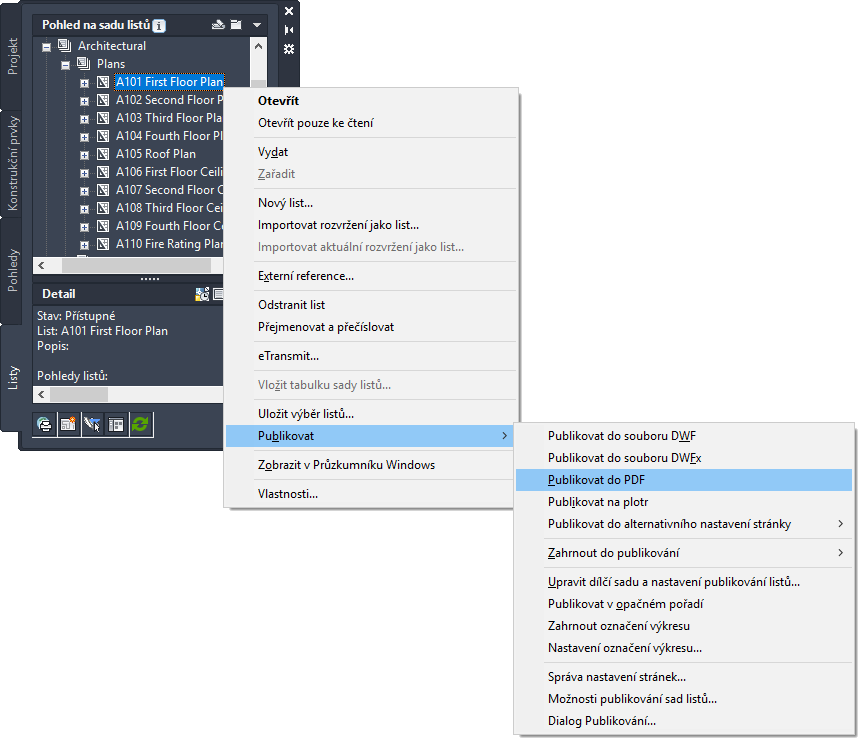 V Pohledu sady listů můžete publikovat listy na plotr, do souboru PDF, DWF nebo DWFx. K sadě listů můžete přiřadit označení výkresu, publikovat listy do alternativního nastavení stránky a zadávat nastavení pro publikování ve formátu PDF, DWF a DWFx.