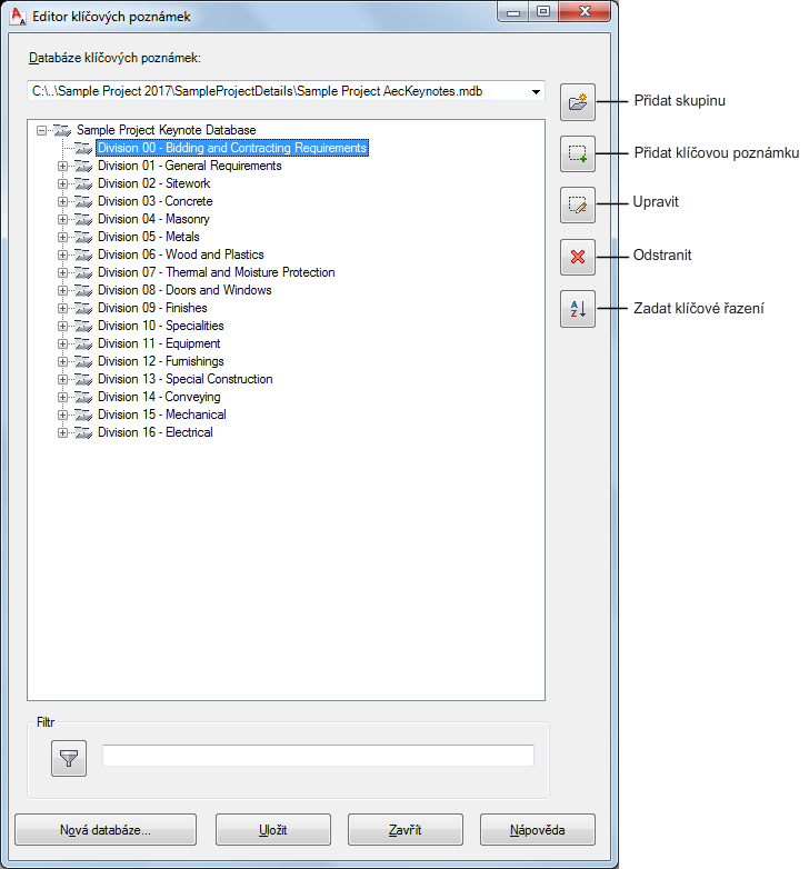 Editor klíčových poznámek je samostatná aplikace, která umožňuje vytvořit a změnit databáze klíčových poznámek. Je-li dialog Editor klíčových poznámek otevřen z nabídky Správce CAD, umožňuje hierarchické stromové prohlížení aktuálně vybrané databáze, která je zobrazena jako kořenový uzel. Pro existující databáze můžete rozbalit kořenový uzel, aby se zobrazily skupiny, a poté můžete rozšířit uzly skupin, aby se zobrazily podskupiny nebo jednotlivé klíčové poznámky. Případně můžete zadat text do pole Filtr, které se nachází pod stromovým zobrazením. Kliknutím na tlačítko Filtr, stisknutím klávesy Tab nebo stisknutím klávesy Enter rozbalíte všechny uzly pod libovolným uzlem, jehož název zahrnuje zadaný text.