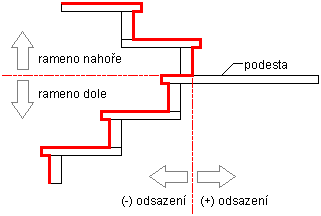 Když vyberete Stupeň ke stupni, Stupeň k podstupnici nebo Podstupnice k podstupnici můžete určit hodnotu odsazení. Kladná hodnota odsazení znamená, že umístění stupně ramene dole je blíže k podestě než umístění stupně ramene nahoře.