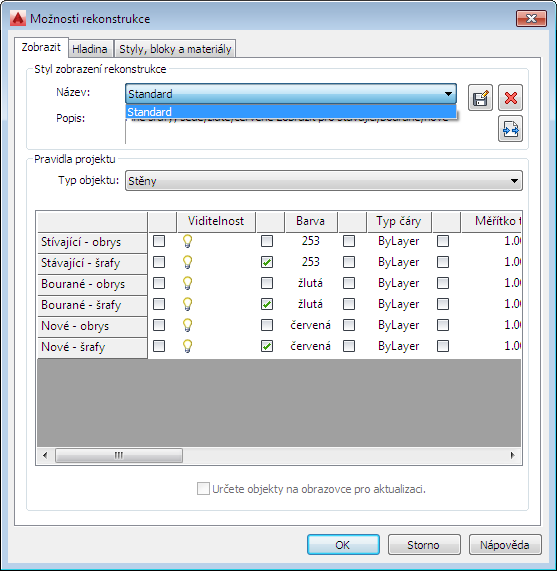 Způsob zobrazení vlastností objektů v rámci konkrétních kategorií je ve výkresu možné změnit tak, že je odemknete, podle typu objektu individuálně změníte a uložíte jako styl zobrazení rekonstrukce. Provedené změny se ukládají do aktuálního výkresu.