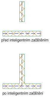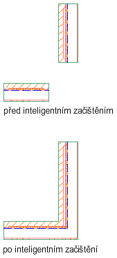 Pomocí funkce inteligentního čištění lze vyčistit průsečíky stěn. Segmenty stěny (kromě kolineárních) budou oříznuty nebo protaženy tak, aby vznikly čisté rohy. Vyberte segmenty stěn a určete metodu začištění. Obecně platí, že pokud vyberete hranici, bude výsledkem začištění T. Pokud nebude vybrána žádná hranice, bude typ začištění L.
