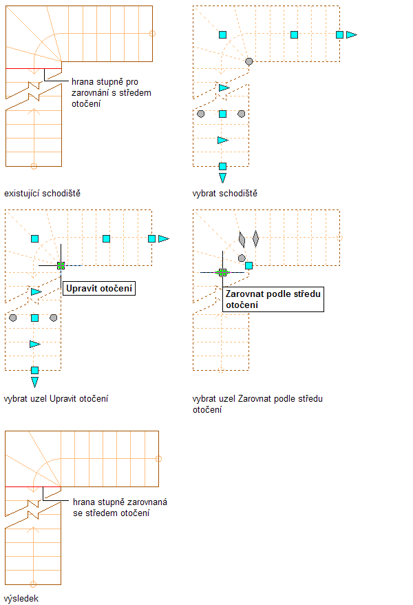 Poznámka: K získání bodu zúžení na hraně schodiště musíte vymazat nastavení Použít čáry podstupnice.