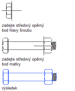 Tento postup slouží k vkládání komponent šroubů, když potřebujete zadat vzdálenost mezi hlavou šroubu a maticí. V tomto příkladu má nástroj pro vkládání šroubu nastavenu vlastnost Pohled na Boční. Pokud je nastavení Hlava nebo Matice, výzva k provedení prvních dvou kroků se uživateli nezobrazí.