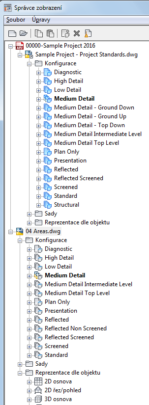 Standardní styly a nastavení zobrazení jsou zobrazeny ve Správci stylů a Správci zobrazení. V závislosti na jejich stavu pokud jde o projektové normy je zde obsaženo množství různých ikon pro jejich rozlišení.