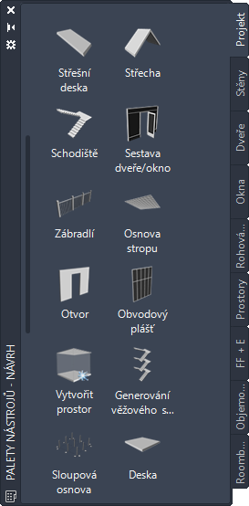 Vlastní palety vytvořené správcem CAD nebo jinými uživateli mohou také obsahovat nástroje pro zónu se styly zóny a vlastnostmi, které jsou upravené pro vaše projekty nebo standardy používané ve vaší firmě.