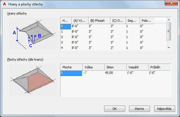 přidat plochu k zvolené hraně klikněte na prázdné místo pod posledním číslem ve sloupci Plocha a zadejte hodnoty pro Výšku a Sklon.