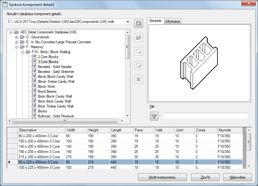 - Chcete-li zobrazit požadovanou komponentu detailů v tabulce v dolní části dialogového okna, přejděte na ni ve stromovém zobrazení nebo použijte mechanismus filtru. (Chcete-li zobrazit celý obsah velké tabulky komponent, můžete použít svislý posuvník v pravé části tabulky.)