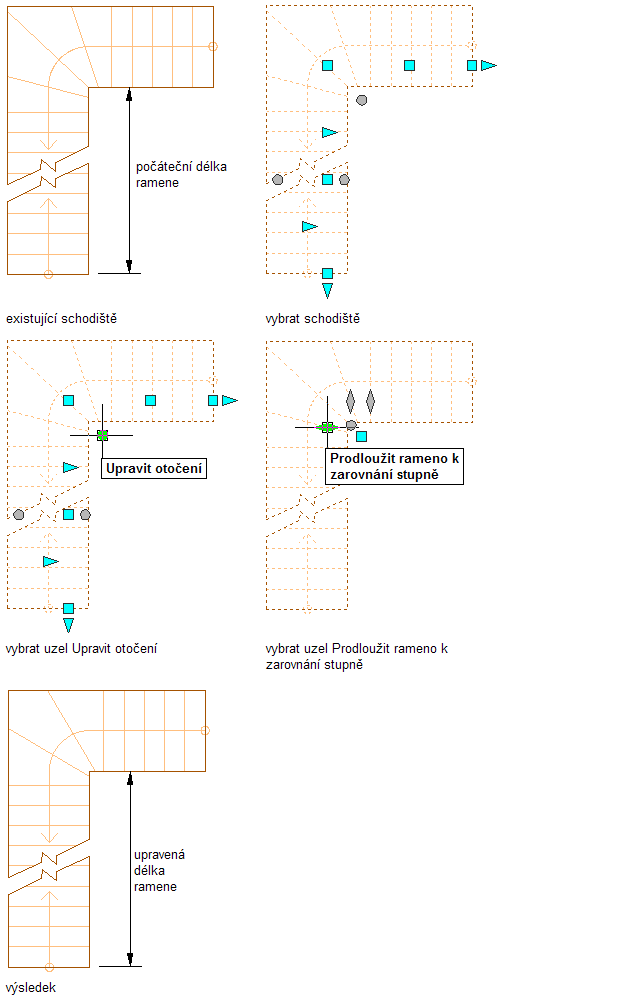 1. Aktivujte uzly výběrem schodiště s 1/2 otočením nebo 1/4 otočením.