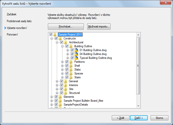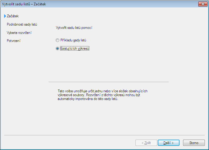 V dialogu Vytvořit sadu listů – Vyberte rozvržení můžete vybírat rozvržení z existujících výkresů a přidávat je k šabloně sady listů jako listy. To je například možné udělat pro převedení převzatých listů na listy projektu