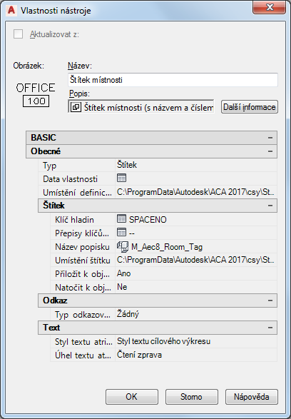 Tento postup se používá k propojení nástroje z katalogu v Prohlížeči obsahu a palety nástrojů v aplikaci AutoCAD Architecture toolset.