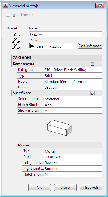Vzhled tabulky Vlastnosti nástroje se liší v závislosti na typu komponenty a aktuální konfiguraci nastavení vlastnosti. V následujících ukázkách jsou uvedeny dvě konfigurace tabulky Vlastnosti nástroje pro nástroj 04 – Zdivo, který je součástí vzorové základní palety nástrojů. V obou případech je nástroj nastaven na přidání standardní spárované cihly 3/8“, ale u první konfigurace je vlastnost Pohled nastavena na Řez, zatímco u druhé je vlastnost nastavena na možnost Prostorový (vzor). U komponent detailů, jejichž orientaci je možné v různých pohledech změnit, určuje nastavení Pohled konkrétní postup kreslení použitý k vložení obrázku do výkresu. Poznámka: Výsledkem různého nastavení možnosti Pohled jsou různé orientace v tabulce. Všimněte si také, že specifikace malty nelze použít pro nastavení Prostorový (vzor) a pro tuto konfiguraci se nezobrazí. V závislosti na dalším nastavení se také mohou lišit vlastnosti zobrazené v části Specifikace. Pokud je například vlastnost Zobrazit maltu nastavena na Ne, když je Pohled nastaven na hodnotu Řez, nezobrazí se žádné další vlastnosti pro maltu. Některých komponent detailů se netýkají žádné specifikace a nezobrazí se záhlaví.