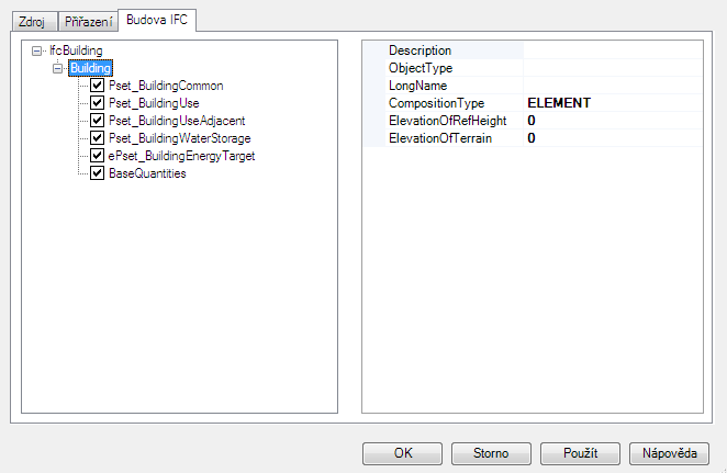Přiřazení předdefinovaných sad vlastností k budově IFC