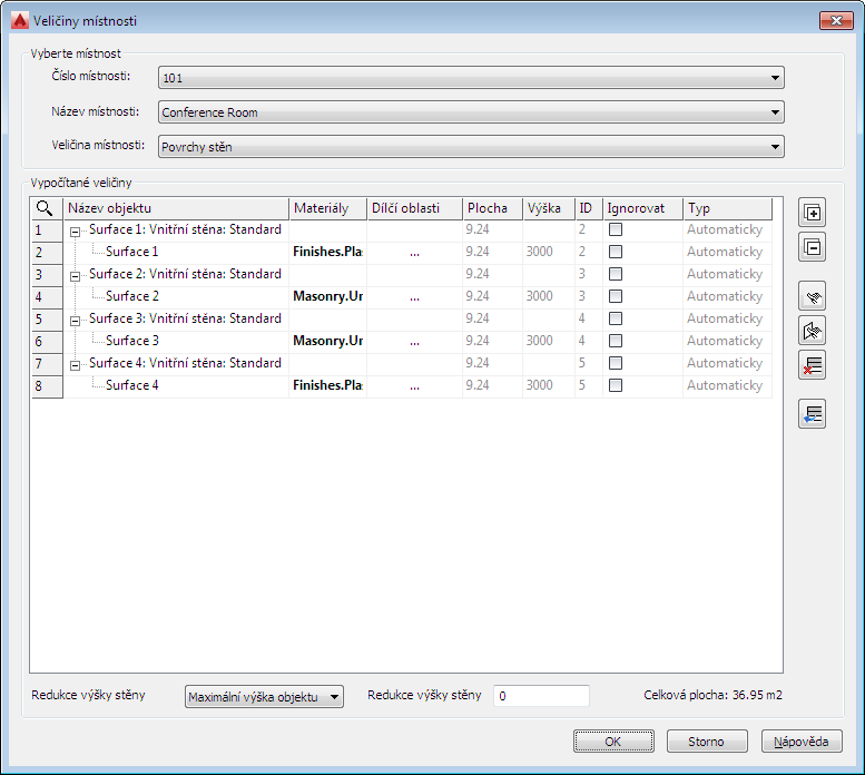 - Vybere vypočtenou veličinu místnosti: povrchy stěn, podlah, stropů, obvody místnosti a objekty nábytku. Vypočtené objekty a hodnoty jsou uvedeny v tabulce v závislosti na vybrané veličině místnosti. Veličiny místnosti jsou vypsány samostatně pro každou místnost (prostor).