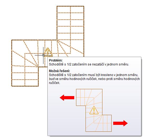 Když aplikace AutoCAD Architecture toolset zjistí problémy se způsobem kreslení objektu schodiště, zobrazí ve výkresu u tohoto schodiště ikonu tipu řešení.