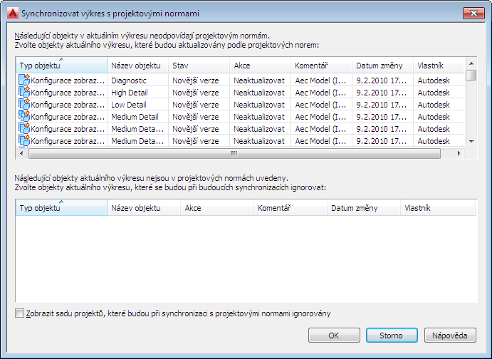 V takovém případě nebude položka v příštích aktualizacích zobrazena s výjimkou případů, kdy vyberete možnost zobrazení sady objektů, které mají být při synchronizaci s projektovými standardy ignorovány, nebo odeberete z nastavení zobrazení ve Správci zobrazení příznak Ignorovat.