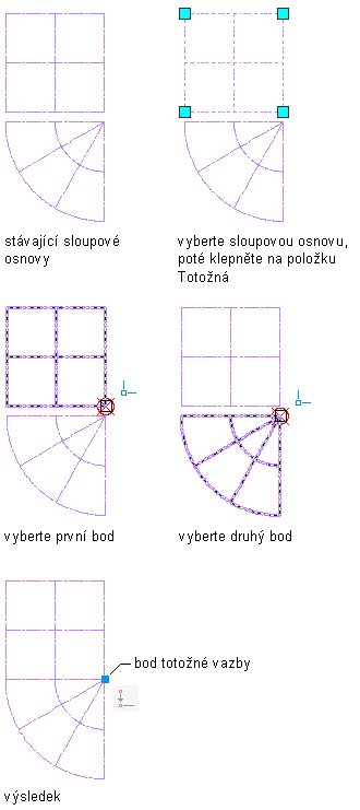 Totožná vazby vytvoří vazbu dvou bodů, které mají být ztotožněny. Zavazbené body mohou ležet přímo na objektu AEC nebo na rozšíření objektu AEC. Totožná vazba funguje také mezi příslušnými objekty AEC a objekty AutoCAD, jako je například segment stěny a úsečka.