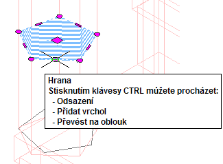 | upravit profil pomocí úchytů | přesuňte podle potřeby úchyt na hraně nebo úchyt vrcholu. U okrajových úchytů existují tři režimy úprav: Odsadit, Přidat vrchol a Převést na oblouk. Výchozí režim je Odsadit, kdy je vybraná hrana odsazena ve směru, který je kolmý na střed hrany. V závislosti na tvaru profilu a hraně, kterou jste vybrali pro úpravy, se sousedící čáry prodlouží nebo zkrátí a podle potřeby se přidají nové čáry. K přidání vrcholu k vybrané hraně a vytvoření nové hrany použijte režim pro úpravy Přidat vrchol. Pokud je vybraná hrana oblouk, bude i nově vytvořená hrana oblouk. Možnost Převést na oblouk změní vybranou hranu na oblouk a protáhne střed hrany. Úchyt na hraně oblouku má také režim Protáhnout, takže můžete protáhnout střed hrany po jejím převedení na oblouk. |