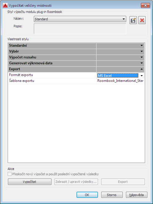 2. V dialogu Vypočítat veličiny místnosti v části Vlastnosti stylu v seznamu Export zvolte v seznamu Formát exportu možnost MS Excel.