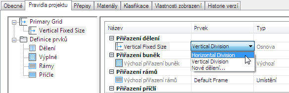 Tento postup použijte pro přiřazení dělení k osnově jednotky obvodového pláště. Dělení definuje orientaci osnovy (zda je směr příčlí a buněk osnovy vodorovný nebo svislý) a typ dělení (počet a velikost buněk).
