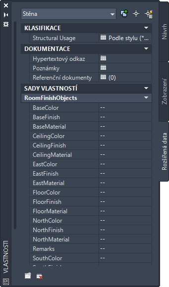 Poznámka: Výpis definice sady vlastností na kartě Rozšířená data se dá ovládat pomocí možností v rozevíracím seznamu Přepsání vlastnosti na kartě Nastavení objektu AEC v dialogu Možnosti.