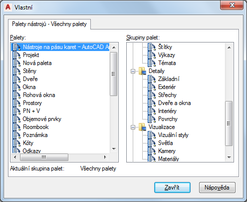 . - Jestliže skupina palet nástrojů projektu obsahuje nejméně jednu paletu, zobrazí se na seznamu dostupných skupin palet nástrojů a může být vybrána.