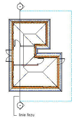 V půdorysu se čára řezu zobrazí tak, jak by měla vypadat v projektové dokumentaci. Značky řezu míří ve směru, ve kterém je řez proveden.