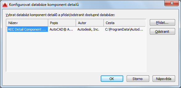 3. Na stránce Obsah AEC zobrazte kliknutím na tlačítko Přidat/Odebrat databáze komponent detailů.