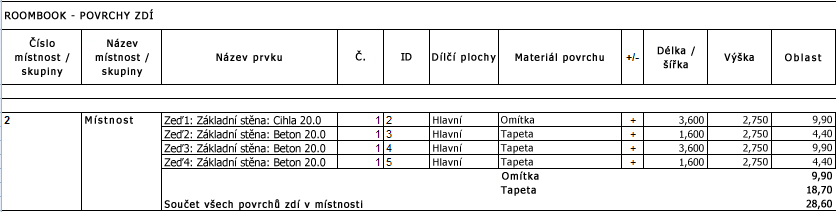Za předpokladu čisté výšky stěny 2,75 m, omítnutí cihlové stěny a tapetování na betonových stěnách bude výstup v aplikaci Excel vypadat následovně: