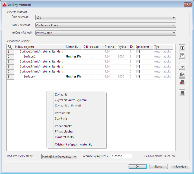 zobrazte všechny související dílčí oblasti: - Dílčí oblasti (okna, dveře, otvory atd.) patřící k vypočtenému povrchu: název, materiál, rozměry atd.