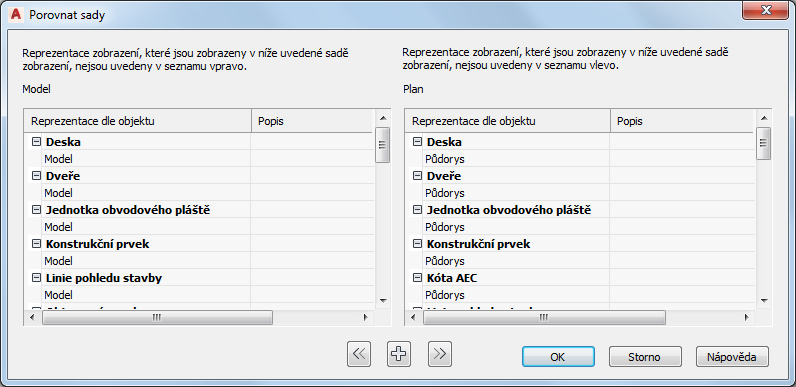 Dialogové okno Porovnat sady zobrazí dva seznamy. Každý seznam obsahuje reprezentace zobrazení, které jsou přiřazeny do určité sady zobrazení, ale nejsou přiřazeny do sady zobrazení v sousedním sloupci.