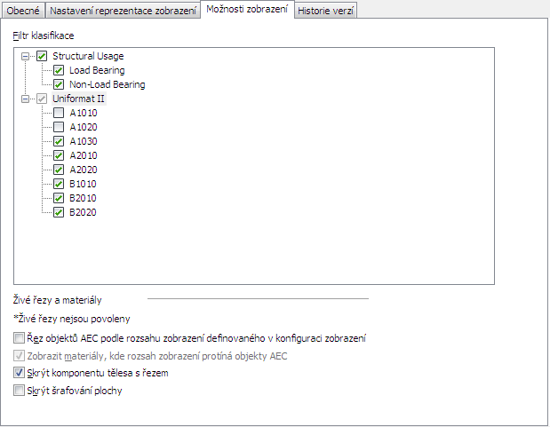 Pokud chcete například skrýt všechny dveře a stěny klasifikované jako A1010 a A1020, zrušte zaškrtnutí políček A1010 a A1020 v části Uniformat II.