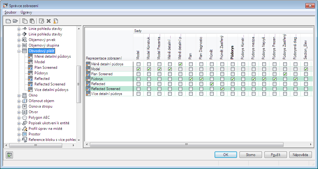 . Reprezentace zobrazení mohou mít různé ikony v závislosti na funkci ve výkresu.