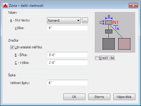 Tento postup slouží k zadání stylu textu, velikosti označení zóny a šipky čáry připojení u vybrané zóny. Můžete také určit, zda bude šrafování zóny použito pouze u přímo připojených prostorů nebo pro ty, které jsou připojeny také pomocí dílčích zón.