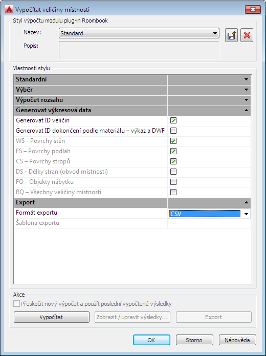 Spustí proces exportu. Export do formátu CSV vytvoří jeden soubor pro každou kategorii veličin místností. Název každého souboru začíná názvem výkresu a názvem typu výpočtu modulu Roombook.