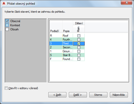 Tento postup slouží k výběru částí budovy, které se mají zahrnout do pohledu při přiřazování hladin a dělení. Pro výkres pohledu můžete vybrat více hladin a dělení, například k vytvoření pohledu na celou budovu. Tím se poskytuje kontext pro výkres pohledu.