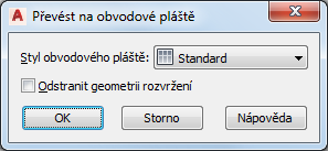 Tento postup použijte, chcete-li vytvořit obvodové pláště, založené na plochách existujících objemových prvků, objemových skupin anebo entit aplikace AutoCAD, jako je síť, přímková plocha anebo těleso. Toto může být užitečné poté, co jste vytvořili model stavby. Pro každou plochu je vytvořen oddělený obvodový plášť. Během procesu převodu jste požádáni o výběr stylu obvodového pláště určujícího počet a velikost buněk v osnově obvodového pláště, stejně jako vzhled buněk, rámu a příčlí.