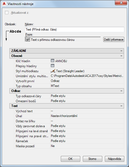 | Obecné/Typ obsahu | Možné hodnoty jsou Mtext (pro základní odstavcové poznámky a klíčové poznámky referencí) nebo Blok (pro symboly s atributy a klíčové poznámky listu). Když vkládáte objekt Mtext ve výchozím nastavení, budete vyzváni k zadání šířky textu. |
