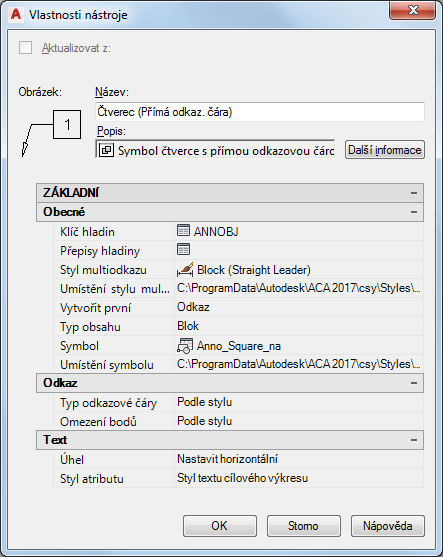 | Obecné/Symbol | Zobrazuje se jen když Typ obsahu je Blok, tato vlastnost určuje blokově orientovaný symbol, který má být použit v poznámce. Pro klíčové poznámky listu blok obsahuje automaticky aktualizované pole hodnot, které určují formát klíčových poznámek, a buď určuje konkrétní klíčovou poznámku nebo slouží jako zástupný symbol. Hodnota zástupného symbolu je následně nahrazena kteroukoliv klíčovou poznámkou spojenou s vybraným objektem, komponentou nebo klíčovou poznámkou vybranou manuálně během vkládání. |
