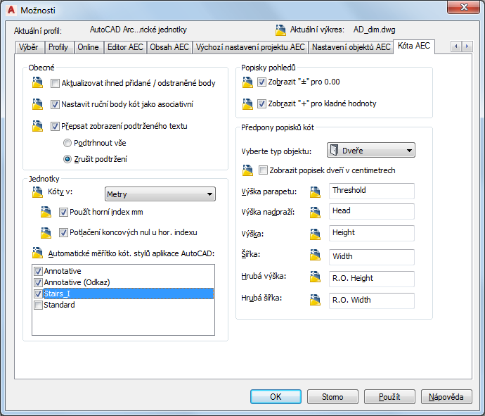Příklad: Změníte jednotky výkresu z metrů na milimetry. V kótovacím stylu aplikace AutoCAD se změní měřítko následujících nastavení: