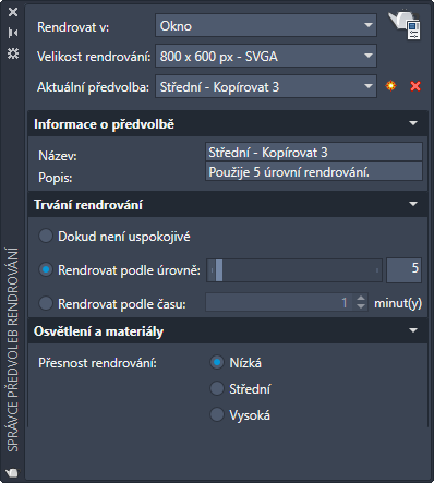 Poznámka: Změnou nastavení standardní předvolby rendrování dojde k vytvoření nové uživatelské předvolby rendrování.