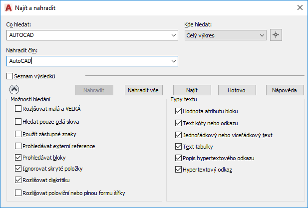 Nastavení Kde hledat určuje, zda se má najít a nahradit text v celém výkresu nebo text v aktuálně vybraném objektu či aktuálně vybraných objektech.