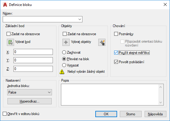 Definice a název bloku jsou uloženy v aktuálním výkresu.