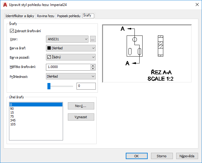 Nastaví šrafovací vzor, který se použije pro všechny šrafy v pohledech řezů.