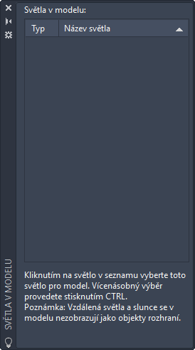 Ikona ve sloupci Typ udává typ světla: bodové světlo, kuželové světlo nebo vzdálené světlo, a zda je zapnuté nebo vypnuté. Vyberte ze seznamu světlo, které chcete zvolit ve výkresu. Chcete-li seznam setřídit, klikněte na záhlaví sloupce Typ nebo Název.