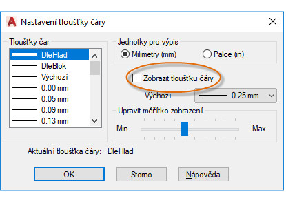 Zobrazení tlouštěk čar můžete ovládat po kliknutí na tlačítko Nastavení tloušťky čáry v dolní části seznamu tlouštěk. V dialogu Nastavení tloušťky čáry můžete zvolit, zda chcete zobrazit nebo skrýt tloušťky čar.