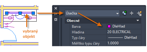 Na paletě Vlastnosti se zobrazují aktuální vlastnosti vybraného objektu. Každou z těchto vlastností můžete změnit tak, že na ni kliknete a změníte nastavení. Vlastnost, která je nastavena na hodnotu DLEHLAD, dědí nastavení ze své hladiny. V předchozím příkladu mají objekty, které byly vytvořeny v hladině 20 ELECTRICAL, nachovou barvu, protože se jedná o výchozí barvu objektů v této hladině.