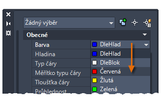 Na paletě Vlastnosti se zobrazuje seznam všech důležitých nastavení vlastností. Kliknutím na libovolné z dostupných polí můžete změnit aktuální nastavení. Pokud nejsou v následujícím příkladu vybrány žádné objekty, změní se nastavení aktuální barvy z možnosti DleHlad na možnost Červená. Všem dále vytvořeným objektům bude poté nastavena vlastnost barvy Červená.